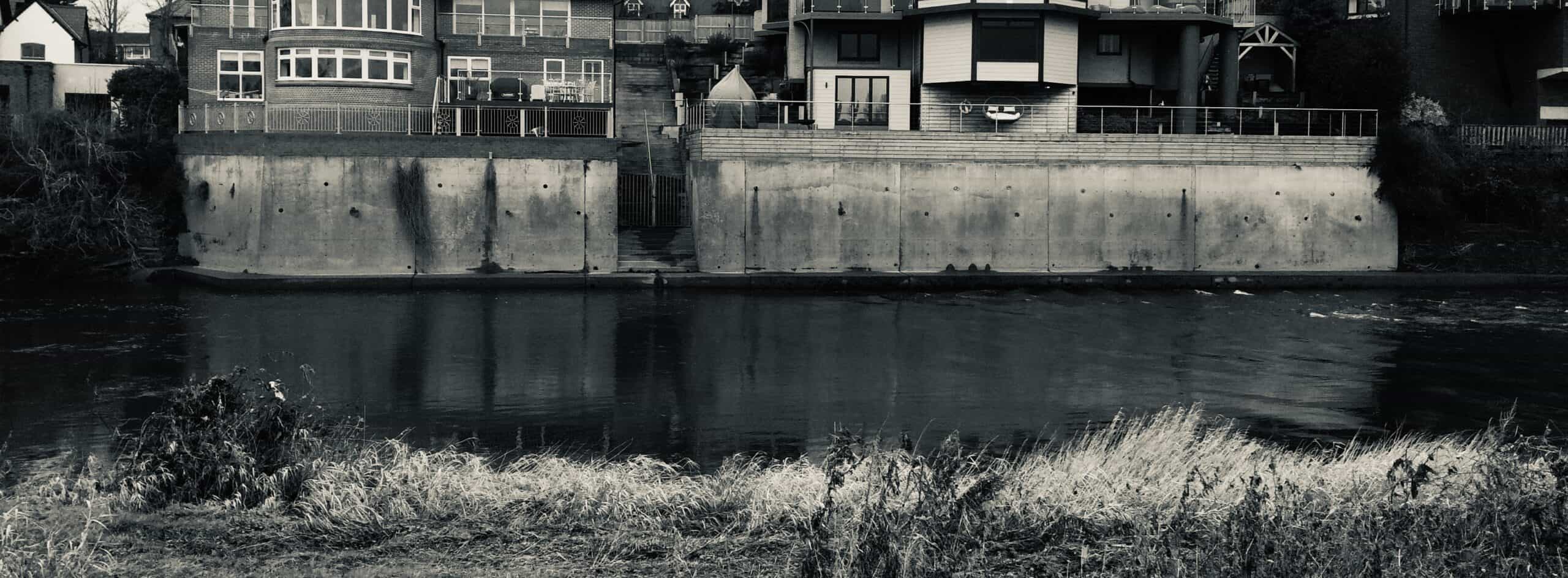 Further on, near the railway bridge, you meet a concrete edifice, where that human spine has twisted down to the water’s edge and the strip gardens have evaporated. The river is supposed to be protected from mortgages and building contracts. Yet they are poured and bolted here to blunt your linearity. Who gave them consent? You never did. Nor the willows, nor the mallards, nor the moorhens.
