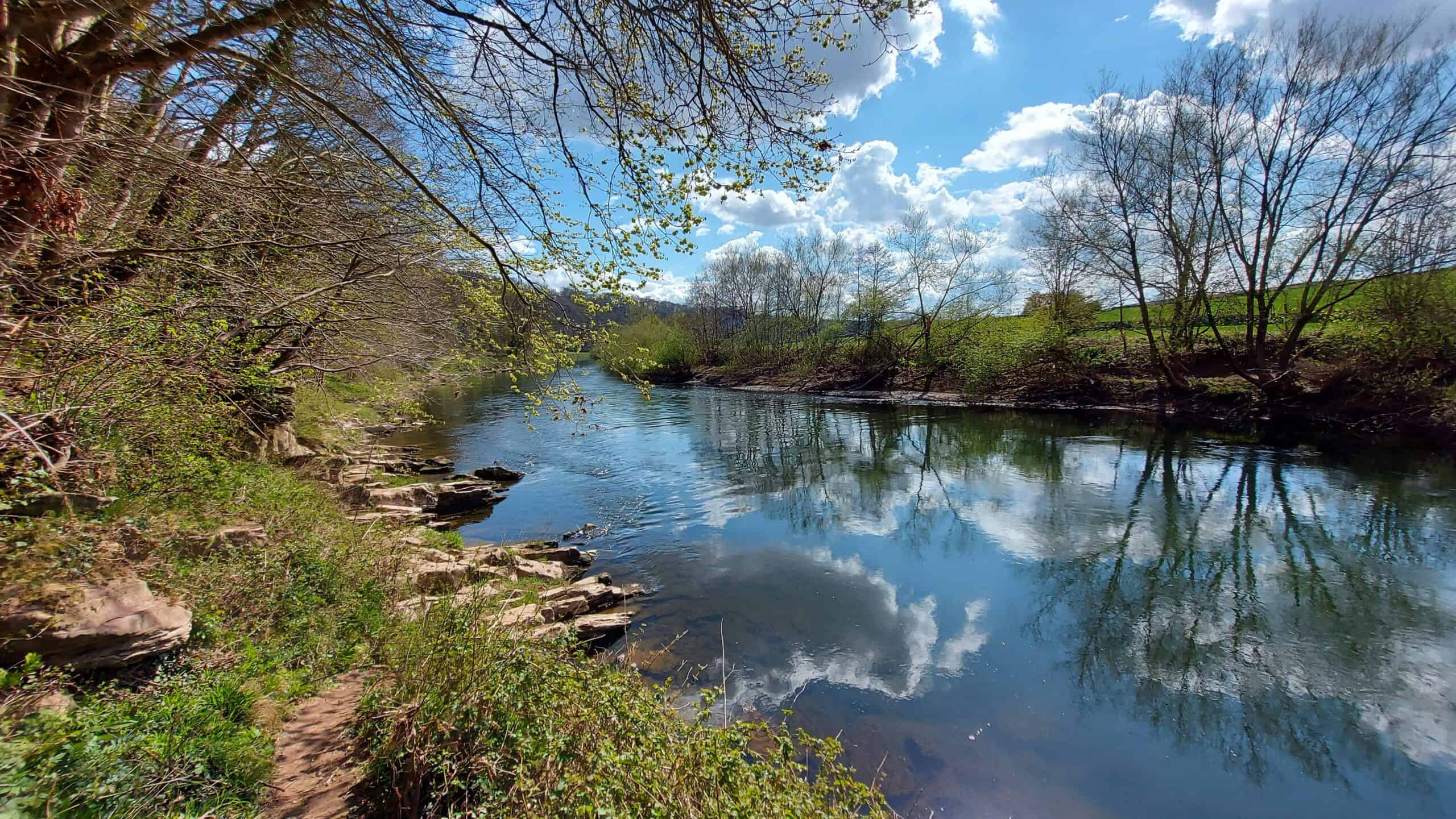So the path swings left as the river widens into the most exquisite vista to the south, the Wye leaning into a high slope of woods, carving the opposite bank where thick Herefordshire farmland sits heavy. There’s a grandmother over there, with her granddaughter, and they are throwing pebbles in the stream. Bredwardine memories stop me still and then empty me.